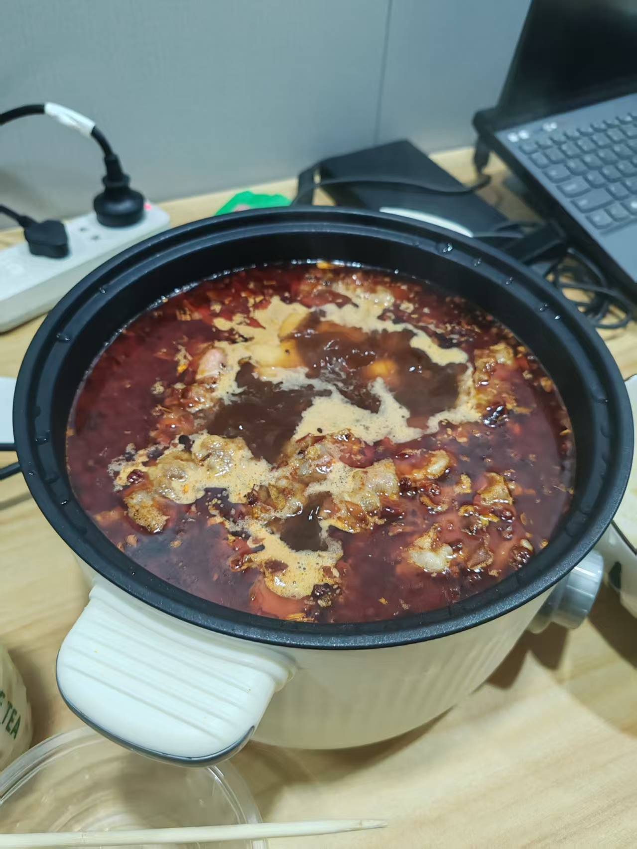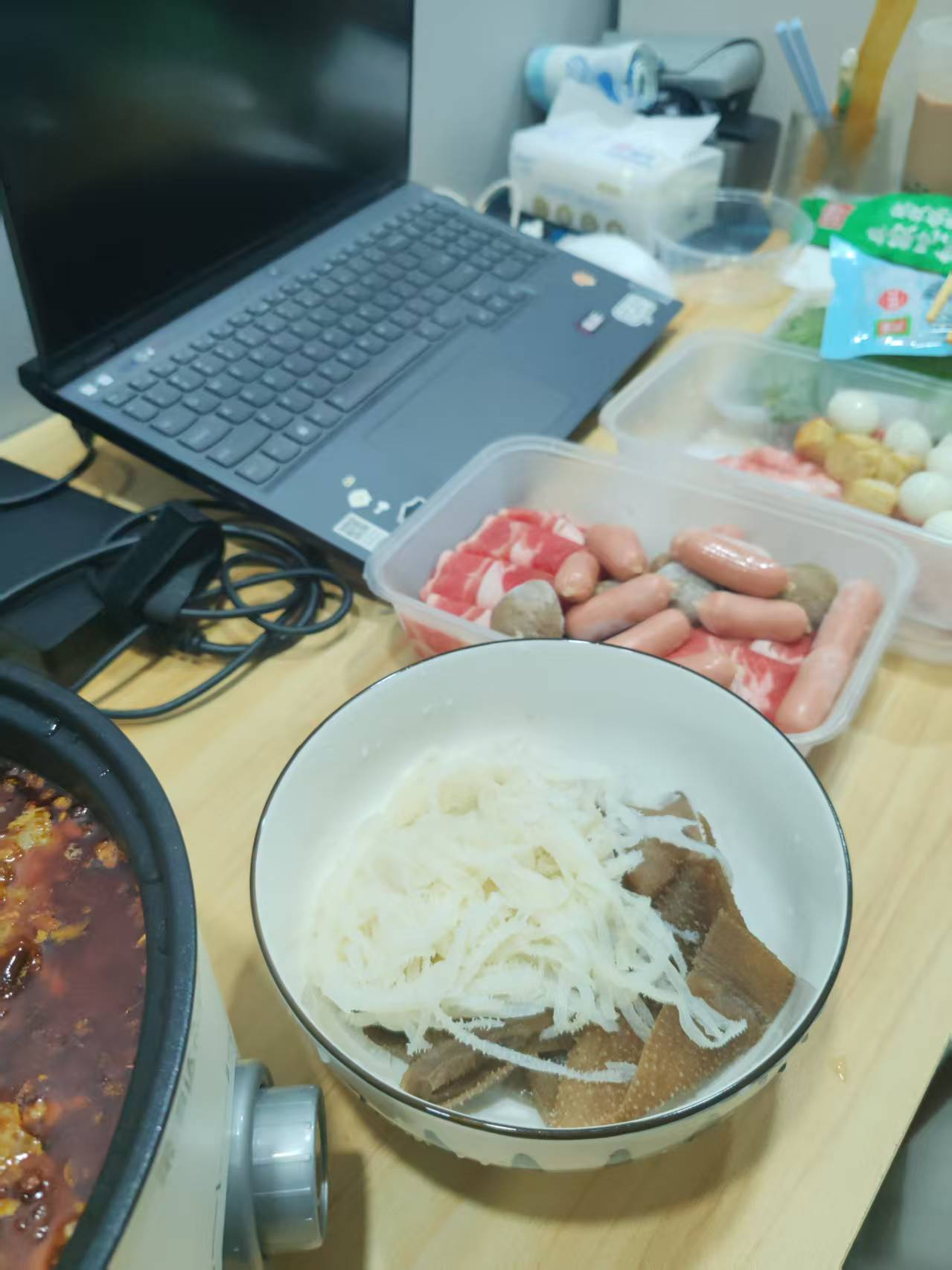 前几天国庆假期都是在家里哪里也没去,今天王逸飞刚到,由于他胃口不错,所以我买了不少火锅食材在家,用我自己的锅来煮一顿火锅招待他,但是他事先也没说不能吃辣,吃的时候干了不少水,还有我的两瓶安慕希🤣。